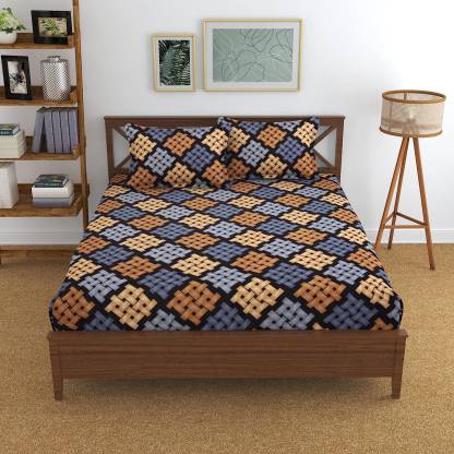 Geometric Floral Fitted (Elastic) Cotton King Bedsheet with 2 Pillow Covers