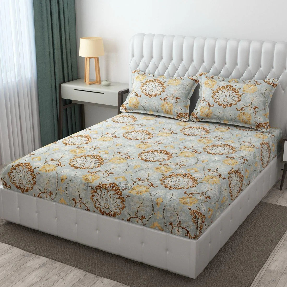 Beautiful Yellow Floral Elastic Fitted Double bed Bedsheet with 2 Pillow Covers