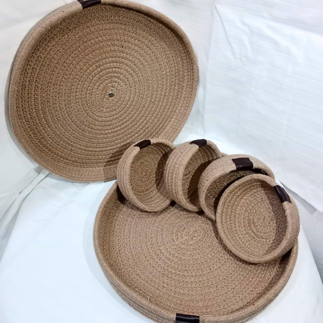Most Viral Natural Cotton Rope Dryfruit Storage Tray with 4 Bowls Set (Brown Shade)