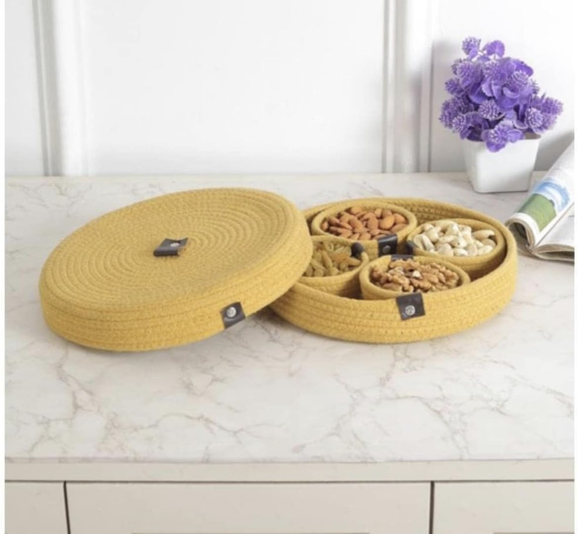 Most Viral Natural Cotton Rope Dryfruit Storage Tray with 4 Bowls Set (Yellow Shade)