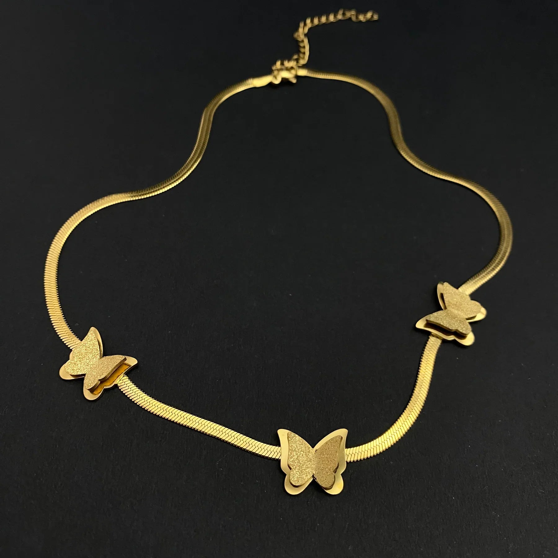 - The necklace features three butterfly pendants arranged in a row, symbolizing transformation, freedom, and beauty. The butterflies often have delicate and intricate detailing, making them stand out as an elegant design.